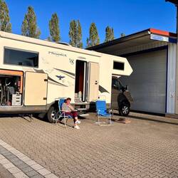 Wir sind spät aufgestanden und haben den Vormittag am Stellplatz verbracht. Einige Mitarbeiter der Fa. Schaffer Mobil waren pflichtbewusst bei der Arbeit. Nette Gespräche mit dem ServicedienstleiterLæs mere