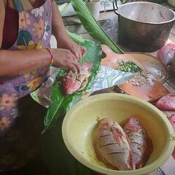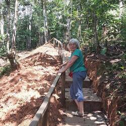 Heute nach dem Frühstück aufgebrochen zum Wasserfall im Dschungel. Vorher noch mit einer Pflanze eingerieben die nach Zitronengras duftete und gegen Moskitos helfen soll.