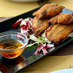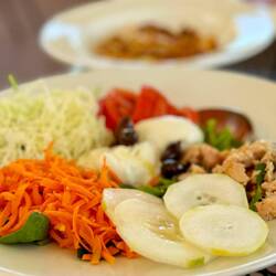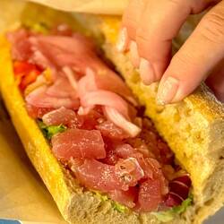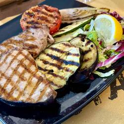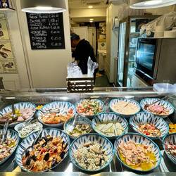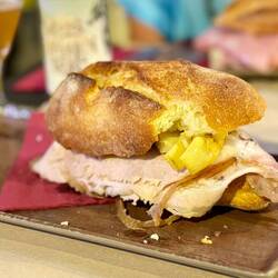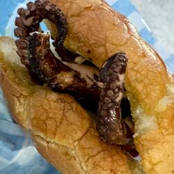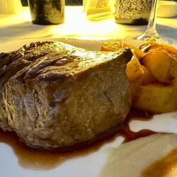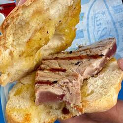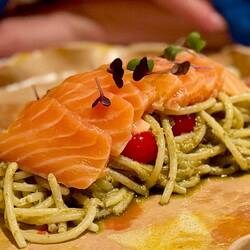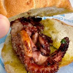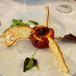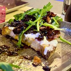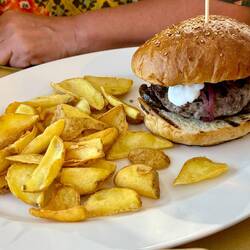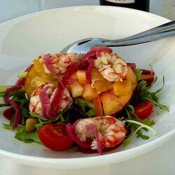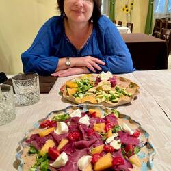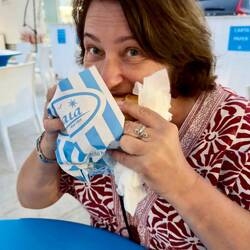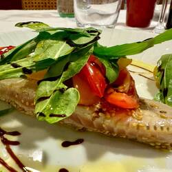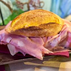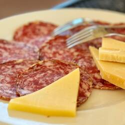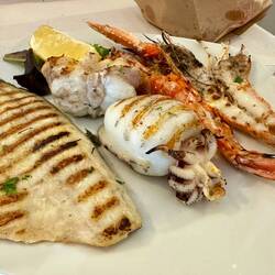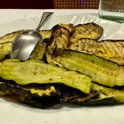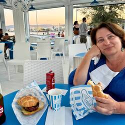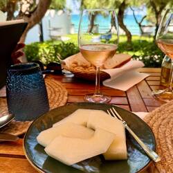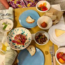 Neskorsie ranajky v Osteria la RIZZA - opat sme to trochu prehnali, dali sme syrovy tanier, sendvic so sunkou a grilovanou cuketou a tanier prosciuttka s mozzarellou di bufala. Skvele jedlo, mierneLes mer
