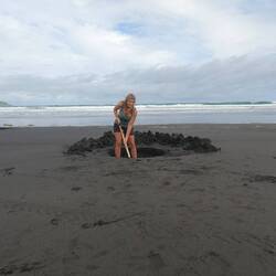 Wir haben noch ein paar Wasserfälle auf der Liste, für richtige Strandtage ist es leider schon zu kühl. Richtig gefreut hatten wir uns dann über diesen tollen Strand. Hier braucht man nur eine Schaufel und buddelt sich bei Ebbe ein Loch in den Strand, schon kommt von unten warmes Wasser aus der Erde und man hat einen eigenen kleinen Hot Pool. So zumindest sah es bei den Einheimischen bei Sonnenuntergang aus. Da es heute Abend aber keine Dusche mehr für uns geben wird, wollten wir das lieber am nächsten Morgen probieren.