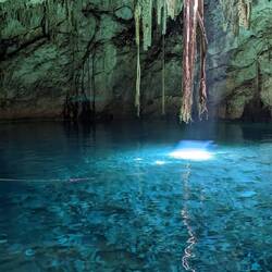 Die Wurzeln vom Baum hängen in der Mitte der Höhle und ragen bis fast ans Wasser der Cenote.