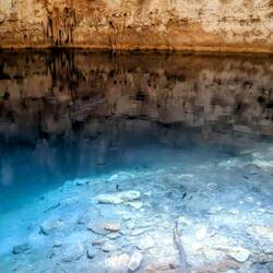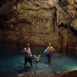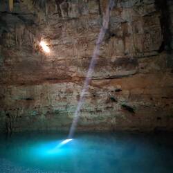 Auf diesem kleinen Campingplatz haben wir zwei Nächte Verbracht. Er wird von zwei lieben Deutschen, Sebastian und Andrea, geführt und noch ausgebaut. Es gibt Strom, WLAN, frisches Brot, eine Kompost Toilette und eine heiße Dusche. Naja zumindest ist das Wasser heiß weil der schwarze Schlauch einmal quer über dem Hof liegt, die Sonne erledigt den Rest. Das Highlight ist aber die eigene Cenote in der wir uns immer wieder abkühlen können. Der Zugang ist natürlich wieder ein sehr enger Gang und diesmal sogar eine wackelige Hängebrücke. Hier scheint nicht ganz so viel Licht rein wie in die anderen, aber das Wasser ist schön blau. Es gibt auch wieder ziemlich große neugierie Fische im Wasser. Da braucht es erstmal überwindung doch reinzuspringen.