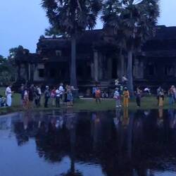 Jetzt wandern wir im dunklen durch Nieselregen über eine Wiese und hoffen auf Sonnenschein am Horizont. Wir hatten Glück. Mit staunen beobachteten wir wie das Angkor Wat zum Vorschein kam und immer größer wurde.