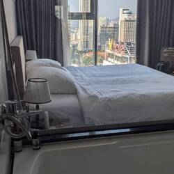 Wir haben ein Zimmer im 25ten Stock mit Meerblick, einem riesen Fenster im Bad und einer Badewanne 😍🙌🏻 in so einem Luxus haben wir noch nie gewohnt.