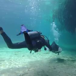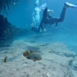 Die 'Casa' Cenote ist so ziemlich das Gegenteil von der 'Dos Ojos' Cenote. Sie ist sehr hell, da sie größtenteils offen ist, hat Vegetation und erstaunlich viele Fische. In der Cenote mischt sich Süßwasser mit Salzwasser aus dem Meer, was immer mal wieder als verschwommenes Flimmern unter Wasser sichtbar war. Während des gesamten Tauchgangs ging es gerade mal auf max. 6m runter, weshalb wir fast ausschließlich mit der Lunge tarieren ("hoch & runter") konnten. Dafür ging es aber durch enge Passagen und durch kleine Spalten. Es ist wie eine kleine Abenteuertour. 🤩