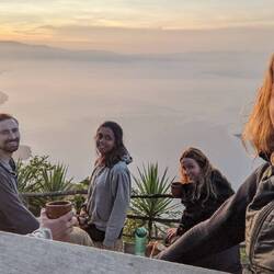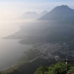 Oben angekommen war bei dem fantastischen Ausblick aber schnell alles andere wieder vergessen! 😍 Mit Kaffee und Brötchen in der Hand sahen wir zu, wie die Sonne langsam über dem Lago de Atitlán aufging. Wir hatten, wie auch die letzten Tage, super Wetter erwischt und konnten die Berge und die Spitzen der Vulkane sehen. (So kurz vor der Regenzeit verschwinden, besonders die Vulkane, häufig im Nebel.) Unser Aussichtspunkt war auf 2236m, direkt auf der sogenannten 'Indian Nose' (daher auch der Name der Wanderung). Von unten soll der Felsen nämlich wie ein liegende Gesicht mit großer Nase aussehen. 😄 Unter uns konnten wir noch weitere Aussichtspunkte sehen. Man hätte stundenlang einfach nur hinunter schauen können. 😍