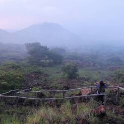 Am Krater angekommen sahen wir wortwörtlich NICHTS 😆. Mileydi schien das nicht zu wundern. Hätte man uns nicht vorwarnen können? Wir warteten ein paar Minuten und konnten dann tatsächlich kurz ein paar Umrisse und sogar den kleinen See unten Im Krater erkennen. Das war's dann aber auch schon. 🤦🏼♀️ Eigentlich hatten wir die Sonnenuntergangstour gebucht (also Sonnenuntergang AUF dem Vulkan), aber Mileydi hustete die ganze Zeit und so blieben wir nicht lange oben, sondern wanderten wieder hinunter und zu einem anderen Aussichtspunkt. Auf dem Weg dorthin besichtigten wir eine Fledermaushöhle, die ganz cool war. Der anderen Aussichtspunkt verschwand ebenfalls völlig im Nebel. Trotzdem sah der Vulkan von dort ziemlich beeindruckend aus. Ich hätte gerne noch etwas gewartet um zu schauen, ob die Sicht am Krater aufklart, aber der Schwefelgeruch war fies und Mileydi überzeugte uns zeitnah den Rückweg anzutreten...